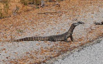 As we returned to Cheynes Beach mid afternoon, along Cheyne Road, we came across a Heath Monitor sunning itself at the side of the road. Luckily no other vehicles were on the road so we were able to watch the ‘Goanna’ for a short while before it got fed-up with our presence and ambled off across the road in front of us. Back at the chalet one of the first birds we saw was a Pallid Cuckoo on the telephone wires just above our parked car and as we did some chores, as well as all the usual species for the campsite we spotted a stunning Gilbert’s Honeyeater near the shower block. Carnaby’s Black Cockatoo feed and roost in the pines in the centre of the campsite, so at c19.00 we wandered along to try our luck. It was a little too early and still light, so we walked to the edge of the campsite where we spotted 3 or 4 birds flying in to the nearby scrub. Edging slowly closer we saw the cockatoos feeding on the Banksia in the distance. Apparently the birds only come to the roost at dusk, which was around 19.40 tonight.