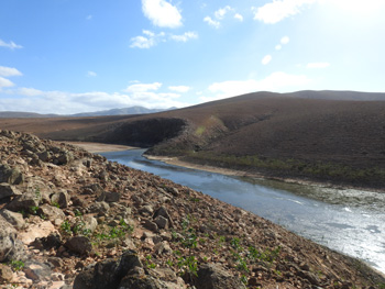 Continuing north to the FV20 we saw at least 4 Raven, Kestrel, Buzzard and 2 Egyptian Vulture with all of the latter species being fairly common in this area. Our next destination was Llanos Pelados; or to be more precise the small dams in the upper reaches of Barranco de Rio Cabras (C p132-2) where a Dwarf Bittern had been overwintering. We arrived at 11.00, parking on the roadside near the household waste recycling centre on Camino Vertedero and walked the 1 km trail to the cliffs overlooking the dams. Walking east (towards coast) from here leads to a track which takes you to the valley floor. Although we did not see our target there was plenty of activity, with several Black-winged Stilt and Ruddy Shelduck, Green Sandpiper, Little Egret, Willow Warbler, Egyptian Vulture, Buzzard, Raven, White Wagtail, Hoopoe, Little Ringed Plover, and at least one pair of Fuerteventura Chat and Plain Swift. Several Atlantic Lizard scurried around our feet as we walked around the stony tracks above and around the dams. After 1½ hours and no sign of the Bittern, we decided to move on.